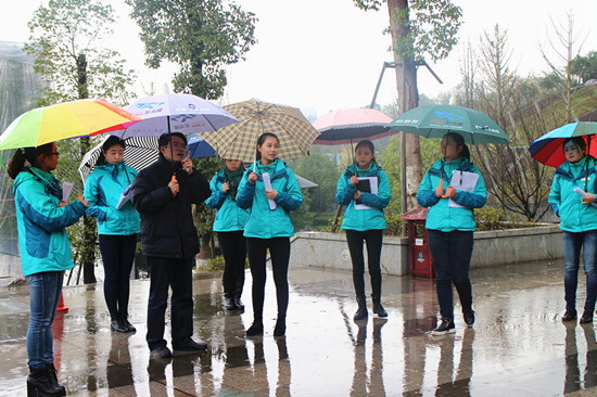 12月15日,院長李永明一行到長壽區(qū)菩提山風(fēng)景區(qū),對景區(qū)導(dǎo)游進(jìn)行《中華長壽寶典導(dǎo)游詞》的專題培訓(xùn)。當(dāng)天氣溫驟降,李院長帶領(lǐng)十多名導(dǎo)游,冒雨迎風(fēng),從山腳景區(qū)大門起步一路拾級而上直達(dá)山頂,用兩個多小時時間,比照一個個景點(diǎn)及相關(guān)導(dǎo)游詞,考察導(dǎo)游們對導(dǎo)游詞熟悉領(lǐng)會、把握講解情況,并多次模擬示范,深入淺出講解,并根據(jù)景點(diǎn)實(shí)際添加新鮮內(nèi)容。導(dǎo)游們學(xué)習(xí)非常用心,一致評價李院長的導(dǎo)游詞寫得有文采,講得更生動,她們熟悉導(dǎo)游詞的過程不僅僅是為了工作,更是學(xué)習(xí)中華文明、了解重慶和長壽地脈文脈與歷史人文、豐富知識和人生的寶貴機(jī)會。