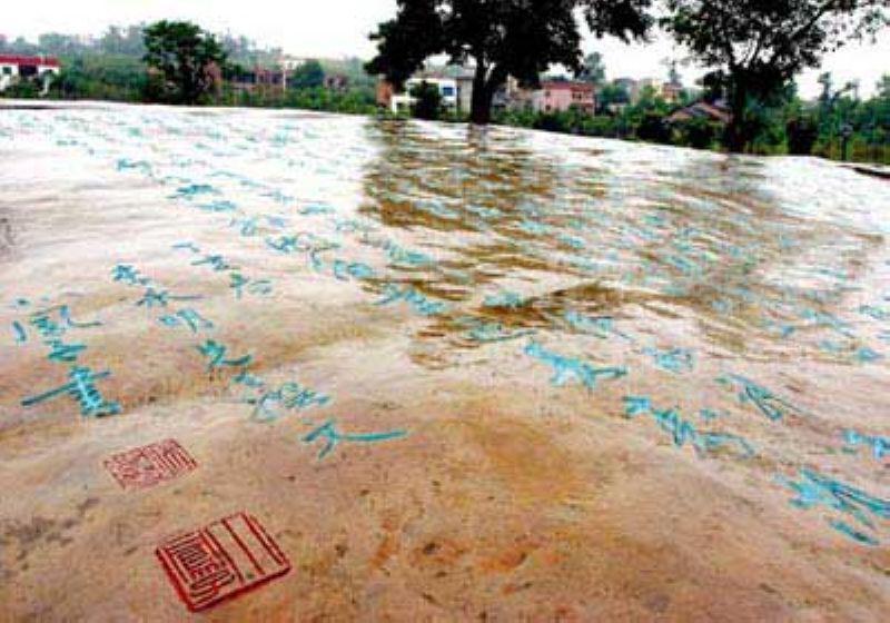 據(jù)書寫該賦的我市知名書法家、本報(bào)編輯張弢介紹,當(dāng)時把這賦轉(zhuǎn)移到巨石上頗費(fèi)了些周折,“是書法與現(xiàn)代科技的結(jié)合!”書寫后先掃描到電腦里放大,然后制作出一張500多平方米的大紙,鋪在巨石上。接著,將字體部分挖空,用刷特制漆涂在上面,最后風(fēng)干后揭開紙,于是,巨大的文字便成功“印”在了巨石上。這項(xiàng)工程動用了20名工匠,耗時整整兩個月才完成!