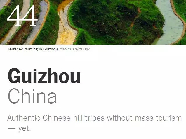 近日,《紐約時(shí)報(bào)》公布了2016年世界上52個(gè)最值得到訪的旅游目的地(即“必到旅游勝地推薦”),中國(guó)僅有貴州和杭州上榜。